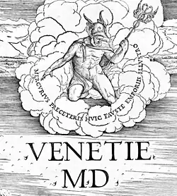 En haut de l'estampe se trouve une représentation de Mercure, le dieu romain du commerce, avec l'inscription en latin « MERCVRIVS PRECETERIS HVIC FAVSTE EMPORIIS ILLVSTRO » (« Moi Mercure brille favorablement sur celui-ci au-dessus de tous les autres emporia »)[9]. Neptune, dieu romain des mers, avec un trident, chevauche un dauphin dans le port, avec l'inscription « AEQVORA TVENS PORTV RESIDEO HIC NEPTVNVS » ( « Je Neptune réside ici, lissant les eaux du port »)[10]. Le titre latin, « VENETI[A]E », est donné en utilisant le cas locatif, localisant spécifiquement l'image avec les dieux « À Venise » ou « Dans Venise »[2]. Les deux dieux sont légèrement décalés par rapport au centre de la gravure pour se trouver de chaque côté et souligner la zone importante du Rialto à la place Saint-Marc[11]. Leur présence concourt surtout à la glorification de la cité : Mercure est une référence évidente au rayonnement économique de la ville, aspect auquel Anton Kolb, lui-même marchand ne pouvait qu'être particulièrement sensible. Neptune évoque la suprématie maritime de la ville[1].