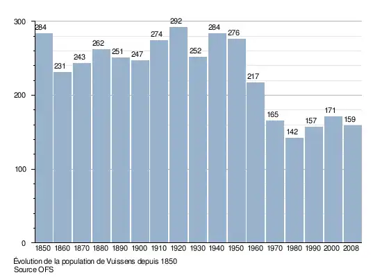 Le graphique suivant résume l'évolution de la population de Vuissens entre 1850 et 2008[7] :