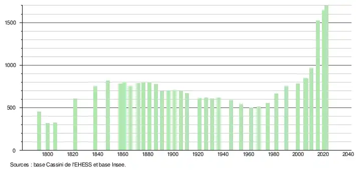 L'évolution du nombre d'habitants est connue à travers les recensements de la population effectués dans la commune depuis 1793. Pour les communes de moins de 10 000 habitants, une enquête de recensement portant sur toute la population est réalisée tous les cinq ans, les populations de référence des années intermédiaires étant quant à elles estimées par interpolation ou extrapolation[22]. Pour la commune, le premier recensement exhaustif entrant dans le cadre du nouveau dispositif a été réalisé en 2005[23].