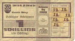 La réussite de l'expérience de la monnaie locale wära à Schwanenkirchen inspira la commune autrichienne de Wörgl sous l'impulsion de son maire, Michael Unterguggenberger, et devant la faillite menaçante, à établir un système semblable, mais sur la base de « certificats de travail ». Le , le bourgmestre transforme la monnaie régulière circulant à Wörgl en une monnaie accélérée du type prôné par Silvio Gesell. La commune émet des bons de 1, 5 et 10 schillings qui seront nommés « bons-travail ». Ces bons avaient la particularité de diminuer de 1 % de leur valeur par mois, 10 schillings à ce régime perdraient en un an 1,20 schilling. Pour conserver des billets de valeur fixe, on pouvait, à la fin de chaque mois, moyennant la perception de la chute de 1 %, faire donner à la mairie un coup de tampon sur le billet, lui rendant sa pleine valeur. Les premiers billets furent émis en août 1932 pour une somme totale de 32 000 schillings. Cette somme était garantie à 100 % en argent autrichien régulier déposé à la caisse d'épargne locale. Cette forme de paiement fut stoppée le [2],[3] et définitivement interdite le de la même année[2],[4]. La banque centrale autrichienne aurait craint pour son monopole de l'émission de monnaie[5]. Le premier emploi des bons fut l'organisation d'un plan de travaux publics. On paya le salaire des ouvriers et on régla les fournitures faites à la ville uniquement en bons-travail. C'est ainsi qu'ils furent introduits dans la circulation. La rapidité de circulation de cette monnaie locale permit d'effectuer en trois mois 100 000 schillings de paiements avec une quantité de bons de 12 000 schillings. Les différents commerces acceptaient donc bons et argent autrichien en parallèle. La nouvelle monnaie ne stimulant pas l'épargne, la caisse d'épargne de Wörgl qui connaissait un excédent de retraits sur ses dépôts de 10 000 schillings en , vit cet excédent tomber à 5 000 schillings en août, après l'introduction des bons et 1 an après les dépôts et les retraits s'équilibraient[6]. Les communes voisines de Kirchbichl, Brixen im Thale, Hopfgarten im Brixental et Westendorf admettent la circulation des bons de Wörgl et émettront à leur tour des bons de travail. Le maire a même le projet de donner à Wörgl le statut d'un « État-libre » et « laboratoire monétaire » sous l'égide de la SDN[7]. L'expérience de Wörgl fit reculer le chômage de 25 % à l'époque de sa mise en œuvre (-), alors que sur l'ensemble de l'Autriche, pour la même période 1932-1933, le chômage augmenta de 20 %[7].