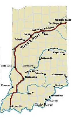 Le Wabash and Erie Canal emprunte le Cross Cut Canal entre Terre Haute et Worthington[16], où il rejoint la White River[17]. Ce canal devait relier l'Indiana Central Canal à Evansville[réf. nécessaire] ; sa construction débute en 1836 mais est abandonnée en 1839[16],[17].