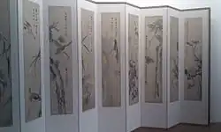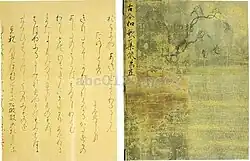- Les paravents. À partir de la seconde moitié du IXe siècle, des paravents ornés de motifs japonais font l'objet de composition de waka (byobu uta) destinés à être calligraphiés sur le paravent ou simplement récités devant, parole d'un personnage peint ou d'un spectateur[14], discours sur le monde à partir d'une représentation du monde[22]. Le waka peut être calligraphié dans le paysage[23], ou sur des « papiers collés » figurés[24], ou encore des éventails peints eux-mêmes sur le paravent[25].