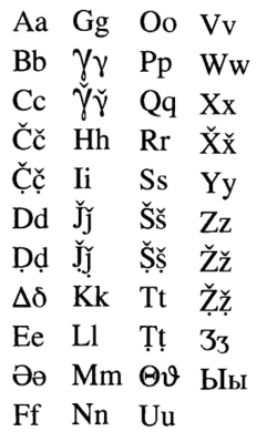 | A | B | C | Č | Č̣ | D | Ḍ | Δ | E | Ə | F | G | Ɣ | Ɣ̌ | H | I | J | J̣̌ | K | L | M | N | O | P | Q | R | S | Š | Ṣ̌ | T | Ṭ | Θ | U | V | W | X | X̌ | Y | Z | Ž | Ẓ̌ | Ʒ | Ы | |||