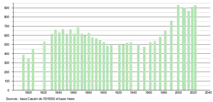 L'évolution du nombre d'habitants est connue à travers les recensements de la population effectués dans la commune depuis 1793. Pour les communes de moins de 10 000 habitants, une enquête de recensement portant sur toute la population est réalisée tous les cinq ans, les populations de référence des années intermédiaires étant quant à elles estimées par interpolation ou extrapolation[20]. Pour la commune, le premier recensement exhaustif entrant dans le cadre du nouveau dispositif a été réalisé en 2008[21].