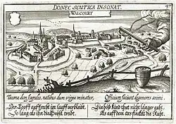 Vue de Walcourt (province de Namur, Belgique). Gravure emblématique avec des vers en latin et en allemand, parue dans: Daniel Meisner, Thesaurus Philopoliticus, Livre II, livraison 5, image n° 47, Francfort-sur-le-Main, 1630.