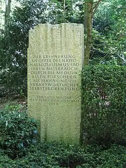 Dans les années 1980, il fut prouvé que les cerveaux des victimes euthanasiées sous le régime national-socialiste ont été utilisés à des fins scientifiques à l'Institut Kaiser-Wilhelm pour la psychiatrie (de) de Munich et au Centre de recherche sur le cerveau à Berlin-Buch. Des coupes de tissus étaient toujours conservées dans les collections scientifiques de l'Institut Max Planck pour la recherche sur le cerveau (maintenant établi à Francfort), de l'Université de Francfort et de l'Institut Max Planck de psychiatrie. Ces restes humains ont été enterrés en 1990 au Waldfriedhof et un mémorial, inauguré le de cette année, y a été érigé.