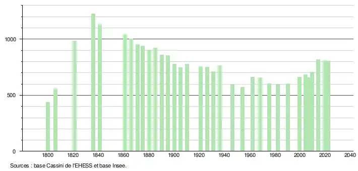 L'évolution du nombre d'habitants est connue à travers les recensements de la population effectués dans la commune depuis 1800. Pour les communes de moins de 10 000 habitants, une enquête de recensement portant sur toute la population est réalisée tous les cinq ans, les populations de référence des années intermédiaires étant quant à elles estimées par interpolation ou extrapolation[11]. Pour la commune, le premier recensement exhaustif entrant dans le cadre du nouveau dispositif a été réalisé en 2004[12].
