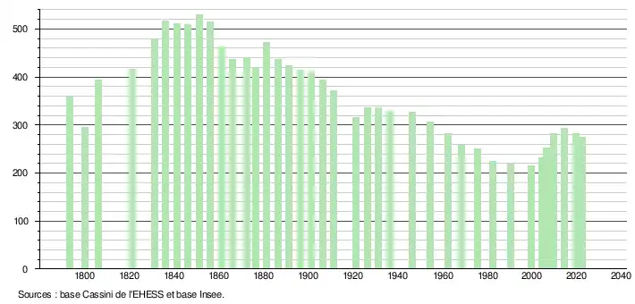 L'évolution du nombre d'habitants est connue à travers les recensements de la population effectués dans la commune depuis 1793. Pour les communes de moins de 10 000 habitants, une enquête de recensement portant sur toute la population est réalisée tous les cinq ans, les populations de référence des années intermédiaires étant quant à elles estimées par interpolation ou extrapolation[30]. Pour la commune, le premier recensement exhaustif entrant dans le cadre du nouveau dispositif a été réalisé en 2004[31].