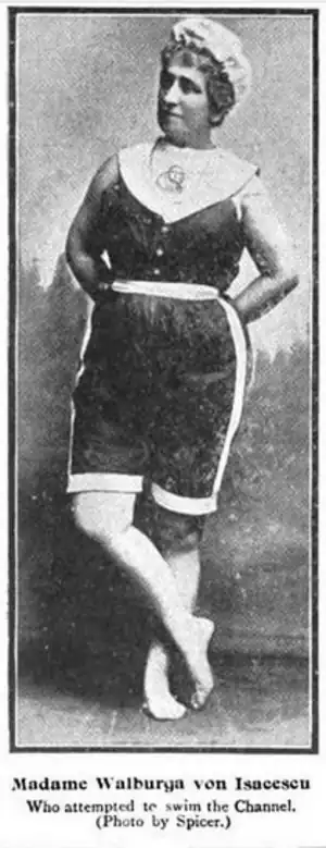 Walpurga von Isacescu tente de traverser la Manche à la nage le 5 septembre 1900 soit une génération avant que la première nageuse ne réussisse le défi avec Gertrude Ederle en 1926. Elle est considérée comme la première nageuse à essayer[1]. La météo et les marées défavorables[2] contribuent à son échec après dix heures et vingt miles[3],[4],[5]. Elle prévoit une autre tentative en 1903[6].