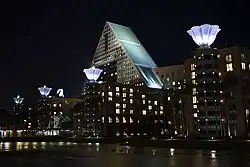 - Quatre ailes symétriques en devant du bâtiment de couleur ocres (sombres pour les 3 premiers étages, plus clair pour les suivants). Leur extrémité méridionale est cylindrique, de couleur turquoise et surmontée par une vasque florale parfois animée par un jet d'eau.