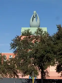 - Deux ailes symétriques en devant du bâtiment de couleur saumon et bleue (sombres pour les 3 premiers étages, plus clair pour les suivants). Leur extrémité septentrionale est surmontée d'une coquille saint-jacques placée à la verticale s'ouvrant en direction du Dolphin. Entre les deux ailes s'ouvrent un jardin très géométrique