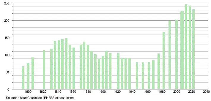 L'évolution du nombre d'habitants est connue à travers les recensements de la population effectués dans la commune depuis 1793. Pour les communes de moins de 10 000 habitants, une enquête de recensement portant sur toute la population est réalisée tous les cinq ans, les populations de référence des années intermédiaires étant quant à elles estimées par interpolation ou extrapolation[13]. Pour la commune, le premier recensement exhaustif entrant dans le cadre du nouveau dispositif a été réalisé en 2007[14].