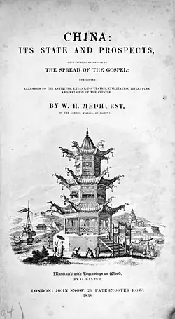 - W. H. Medhurst, China : its state and prospects, with special reference to the spread of the gospel; containing allusions to the antiquity, extent, population, civilization, literature, and religion of the Chinese, Boston, Crocker & Brewster, (OCLC 5314739, lire en ligne)