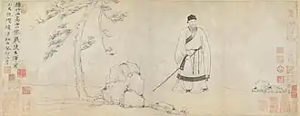 En ce qui concerne les portraits extérieurs à la cour et au clergé, on dispose de moins de témoignages, mais l'unique œuvre qui reste du plus grand portraitiste de la fin des Yuan, Wang Yi, nous en donne une idée, de même qu'un portrait anonyme dû au paysagiste Ni Zan[n 3]. En fait, Wang Yi réalise le portrait en collaboration avec Ni Zan, qui y porte une inscription datée de 1363. Il représente le poète lettré Yang Qian, ou Yang Zhuxi (« Bambou occidental », son nom d'artiste), flânant seul, muni d'un bâton, vêtu d'une robe et d'un couvre-chef. Wang Yi peint le personnage, Ni Zan les rochers et le pin. Des descriptions chinoises de la peinture louent l'habileté du portraitiste à saisir « la droiture et la respectabilité » de Yang Zhuxi. Bien que cela soit vrai, on doit aussi noter que sa caractérisation ne vient pas (comme l'affirment avec insistance les théoriciens chinois) d'une description pénétrante de la physionomie qui peut révéler la nature profonde du sujet — le visage est aimable et dépourvu d'expression — mais, comme c'est la coutume dans les portraits chinois, de la posture, des attributs, du décor, qui fonctionnent tous comme des signes destinés à être lus par le spectateur intelligent[2].