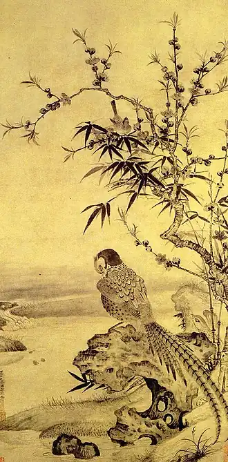 - Faisans et petit oiseau avec pêches et bambous, rouleau mural, encre sur papier, daté 1349. 111,9x55,7 centimètres.