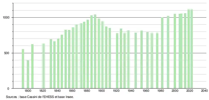 L'évolution du nombre d'habitants est connue à travers les recensements de la population effectués dans la commune depuis 1793. Pour les communes de moins de 10 000 habitants, une enquête de recensement portant sur toute la population est réalisée tous les cinq ans, les populations de référence des années intermédiaires étant quant à elles estimées par interpolation ou extrapolation[23]. Pour la commune, le premier recensement exhaustif entrant dans le cadre du nouveau dispositif a été réalisé en 2008[24].