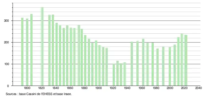 L'évolution du nombre d'habitants est connue à travers les recensements de la population effectués dans la commune depuis 1793. Pour les communes de moins de 10 000 habitants, une enquête de recensement portant sur toute la population est réalisée tous les cinq ans, les populations de référence des années intermédiaires étant quant à elles estimées par interpolation ou extrapolation[23]. Pour la commune, le premier recensement exhaustif entrant dans le cadre du nouveau dispositif a été réalisé en 2006[24].