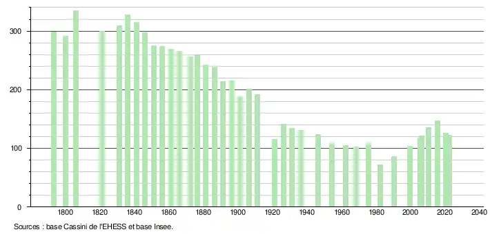 L'évolution du nombre d'habitants est connue à travers les recensements de la population effectués dans la commune depuis 1793. Pour les communes de moins de 10 000 habitants, une enquête de recensement portant sur toute la population est réalisée tous les cinq ans, les populations de référence des années intermédiaires étant quant à elles estimées par interpolation ou extrapolation[30]. Pour la commune, le premier recensement exhaustif entrant dans le cadre du nouveau dispositif a été réalisé en 2005[31].