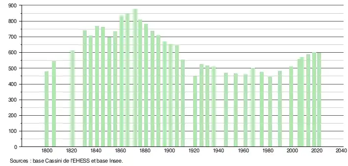 L'évolution du nombre d'habitants est connue à travers les recensements de la population effectués dans la commune depuis 1800. Pour les communes de moins de 10 000 habitants, une enquête de recensement portant sur toute la population est réalisée tous les cinq ans, les populations de référence des années intermédiaires étant quant à elles estimées par interpolation ou extrapolation[23]. Pour la commune, le premier recensement exhaustif entrant dans le cadre du nouveau dispositif a été réalisé en 2008[24].