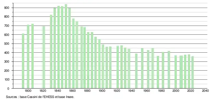 L'évolution du nombre d'habitants est connue à travers les recensements de la population effectués dans la commune depuis 1793. Pour les communes de moins de 10 000 habitants, une enquête de recensement portant sur toute la population est réalisée tous les cinq ans, les populations de référence des années intermédiaires étant quant à elles estimées par interpolation ou extrapolation[31]. Pour la commune, le premier recensement exhaustif entrant dans le cadre du nouveau dispositif a été réalisé en 2007[32].