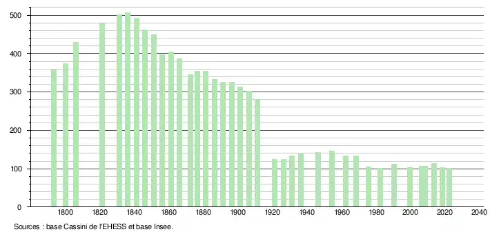 L'évolution du nombre d'habitants est connue à travers les recensements de la population effectués dans la commune depuis 1793. Pour les communes de moins de 10 000 habitants, une enquête de recensement portant sur toute la population est réalisée tous les cinq ans, les populations de référence des années intermédiaires étant quant à elles estimées par interpolation ou extrapolation[15]. Pour la commune, le premier recensement exhaustif entrant dans le cadre du nouveau dispositif a été réalisé en 2008[16].