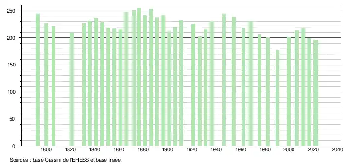 L'évolution du nombre d'habitants est connue à travers les recensements de la population effectués dans la commune depuis 1793. Pour les communes de moins de 10 000 habitants, une enquête de recensement portant sur toute la population est réalisée tous les cinq ans, les populations de référence des années intermédiaires étant quant à elles estimées par interpolation ou extrapolation[38]. Pour la commune, le premier recensement exhaustif entrant dans le cadre du nouveau dispositif a été réalisé en 2006[39].