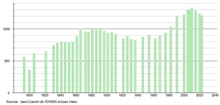 L'évolution du nombre d'habitants est connue à travers les recensements de la population effectués dans la commune depuis 1793. Pour les communes de moins de 10 000 habitants, une enquête de recensement portant sur toute la population est réalisée tous les cinq ans, les populations de référence des années intermédiaires étant quant à elles estimées par interpolation ou extrapolation[46]. Pour la commune, le premier recensement exhaustif entrant dans le cadre du nouveau dispositif a été réalisé en 2004[47].