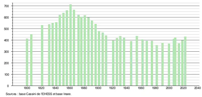 L'évolution du nombre d'habitants est connue à travers les recensements de la population effectués dans la commune depuis 1800. Pour les communes de moins de 10 000 habitants, une enquête de recensement portant sur toute la population est réalisée tous les cinq ans, les populations de référence des années intermédiaires étant quant à elles estimées par interpolation ou extrapolation[29]. Pour la commune, le premier recensement exhaustif entrant dans le cadre du nouveau dispositif a été réalisé en 2008[30].