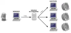 Dans ce modèle, une webradio génère un flux audio (voix des animateurs, chansons, jingles...) vers un serveur de lecture en continu qui se charge de le diffuser aux clients qui s'y connectent. Dans le cas d'une station classique, elle prépare le flux en studio (avec platines, ordinateurs, mixage, micros, etc.) qui est ensuite encodé : le signal analogique est codé dans un format numérique à l'aide d'un codec. Elle envoie ce flux audionumérique vers le serveur de lecture en continu, qui se charge de le redistribuer vers les auditeurs de la webradio. Bien souvent, les webradios n'ont pas de studio, et fonctionnent de manière beaucoup plus simple. Par exemple, dans le cas d'une radio qui diffuse de la musique, tout peut se faire directement en numérique : un lecteur multimédia se connecte au serveur de lecture en continu et joue une liste de titres plus ou moins aléatoirement. Une webradio peut techniquement diffuser des flux numériques d'autres sortes, par exemple de la vidéo, à l'aide des mêmes briques logicielles.