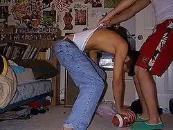 - Le hanging wedgie (« wedgie pendaison ») consiste à suspendre la victime par ses sous-vêtements de façon à la soulever du sol[11].