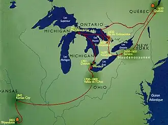 Après 1649, une autre partie des Wendats fuit vers l'Ouest et s'installe au Michigan et en Ohio puis, après le XVIIIe siècle, ils sont divisés en trois groupes : un au Michigan et en Ontario (la Nation Wyandot d'Anderdon), l'autre au Kansas et le troisième en Oklahoma, dans l'actuelle réserve wendat de Wyandot.