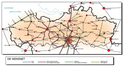 - Le train-léger, dont fait partie le RER de Bruxelles auquel le Wensplan ajoute 12 autres lignes prévues autour de :