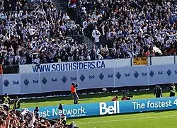 Supporters des Whitecaps fêtant la victoire 4–2 contre le Toronto FC à l'Empire Field pendant le match inaugural de MLS