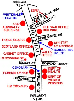 Les principaux bureaux historiques des ministères, de l'amirauté, de l'armée, du trésor et de la résidence du premier ministre se trouvent tous à Whitehall. En conséquence, la Civil Service britannique est connue métonymiquement sous le nom de « Whitehall ». La zone tire son nom du palais de Whitehall, une grande résidence royale de l'ère Tudor qui se trouvait autrefois sur le site.