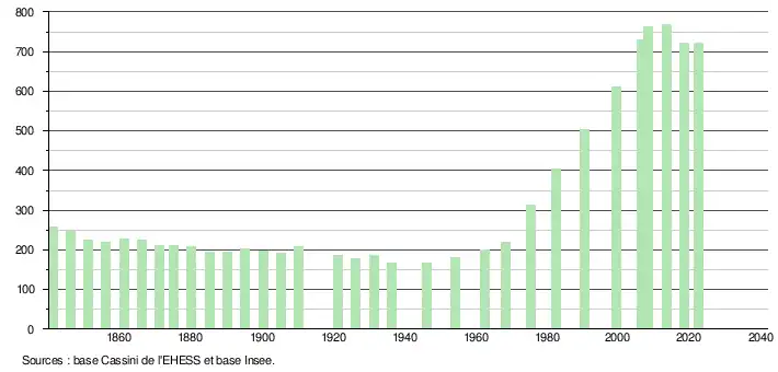 L'évolution du nombre d'habitants est connue à travers les recensements de la population effectués dans la commune depuis 1841. Pour les communes de moins de 10 000 habitants, une enquête de recensement portant sur toute la population est réalisée tous les cinq ans, les populations de référence des années intermédiaires étant quant à elles estimées par interpolation ou extrapolation[22]. Pour la commune, le premier recensement exhaustif entrant dans le cadre du nouveau dispositif a été réalisé en 2008[23].