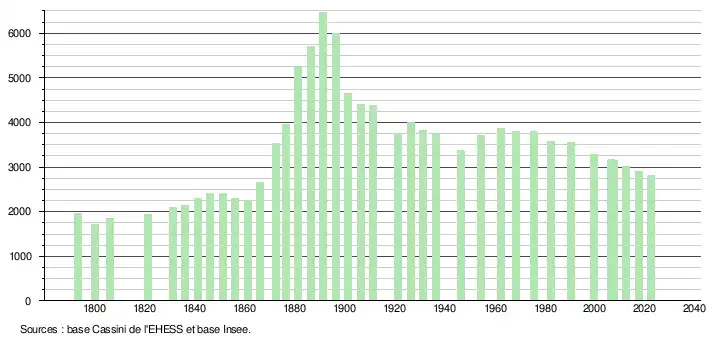 L'évolution du nombre d'habitants est connue à travers les recensements de la population effectués dans la commune depuis 1793. Pour les communes de moins de 10 000 habitants, une enquête de recensement portant sur toute la population est réalisée tous les cinq ans, les populations de référence des années intermédiaires étant quant à elles estimées par interpolation ou extrapolation[30]. Pour la commune, le premier recensement exhaustif entrant dans le cadre du nouveau dispositif a été réalisé en 2007[31].