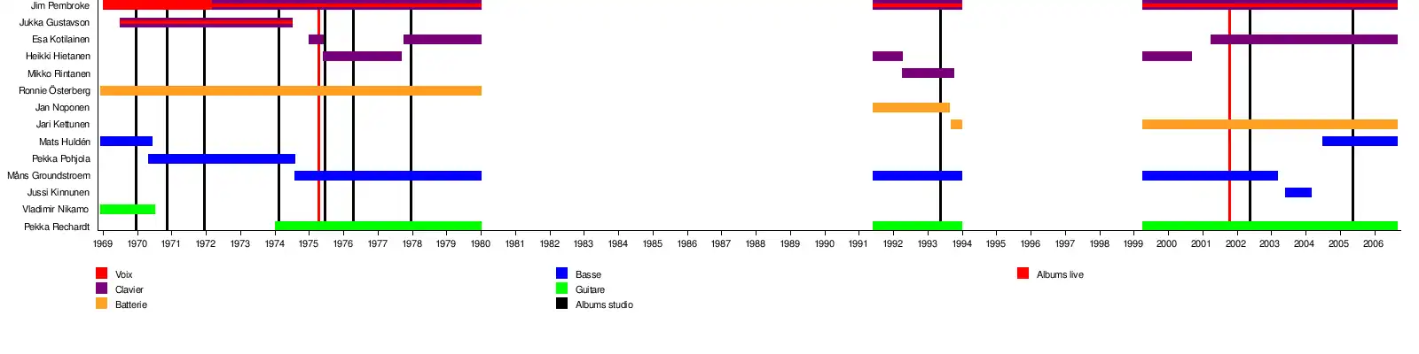 Le groupe s'est formé autour d'un Britannique expatrié, Jim Pembroke, accompagné de Jukka Gustafsson (qui fit partie du groupe jusqu'en 1974), de Ronnie Österberg (jusqu'en 1980), de Mats Huldén et de Vladimir Nikamo. Pekka Pohjola, bassiste qui jouera après ce groupe avec Mike Oldfield et entreprendra une carrière solo à succès, a participé à ce groupe de 1970 à 1974.