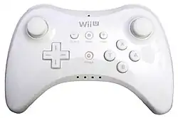La manette Wii U Pro, ou Wii U Pro Controller, est une manette sans fil de jeu pour la Wii U. Elle peut fonctionner indépendamment d'une télécommande Wii. La manette dispose de 8 boutons principaux (A, B, X, Y, L, R, ZL, ZR), des boutons Start, Select, Home et Power et de deux sticks analogiques « cliquables ». Elle possède ainsi les mêmes boutons que le Wii U GamePad mais sans l'écran tactile, le bouton TV, la puce NFC, l'accéléromètre[28] et le gyroscope[28]. Son design se rapproche de celui de la manette de la Xbox 360 mais les sticks analogiques sont placés tous deux en haut, une première pour une manette. Selon Nintendo, la manette Wii U Pro est une évolution de la Manette Classique Pro de la Wii. Elle fonctionne grâce à une batterie rechargeable via USB son autonomie est d'environ 80 heures et elle dispose d'une fonction vibration[29]. La manette Wii U Pro est compatible uniquement avec les jeux Wii U portant un logo sur leurs boites, elle n'est pas compatible avec les jeux Wii originaux. Elle est vendue directement avec certains packs Premium ou séparément et est disponible en noir ou en blanc.