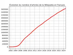 Depuis sa création, le contenu de l'encyclopédie Wikipédia n'a cessé de grandir, en quantité, dans des proportions difficilement imaginables à ses débuts. Au départ comparable aux autres encyclopédies existantes, elle les a rapidement dépassées en taille et en couverture[52]. Wikipédia est l'un des sites les plus fréquentés au monde, recevant plus de 700 millions de visites quotidiennes à la fin 2022[53]. Il constitue le plus grand et le plus populaire des ouvrages de références générales d'Internet, comptabilisant 190 millions de pages disponibles fin 2022[54].
