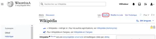 Sur chaque page, des onglets permettent d'accéder aux fonctions de modification, soit par l'intermédiaire d'un éditeur visuel, soit par l'intermédiaire du code source, le wikicode[Note 16]. Un historique permet de lister les auteurs et de consulter les modifications successives de l'article par ses rédacteurs. Ces modifications sont identifiées par l'adresse IP du rédacteur ou par son pseudonyme s'il s'est préalablement identifié[48].