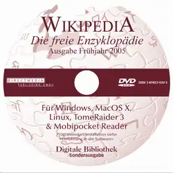 La version allemande de Wikipédia fut vendue sur CD-ROM, puis sur DVD à partir du deuxième semestre 2004 : le nombre de 10 000 CD-ROM vendus fut franchi en avril 2005. En avril 2007, une sélection d'environ 2 000 articles de la version anglaise fut éditée sur CD-ROM par la société française Linterweb[20]. À la même époque, le projet moulinWiki, initié par IESC-Geekcorps-Mali, proposa une version intégrale incluant tous les articles, sans les images, réunis sur une image disque de 554 Mo[21]. La diffusion d'un DVD d'une sélection d'articles Wikipédia en français a fait l'objet d'un projet équivalent au projet anglophone, mais il n'a pas abouti. Un projet de diffusion de documents électroniques imprimables sur un sujet donné, Les Cahiers de Wikipédia[Note 5], a lui aussi été abandonné.