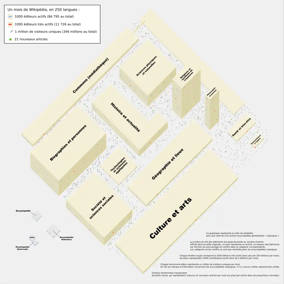 Chaque fenêtre rouge correspond à 1 000 contributeurs « très actifs » (avec plus de 100 contributions par mois), les bleus représentent 1 000 contributeurs « actifs » (plus de cinq contributions par mois). Chaque bonhomme bâton représente un million de visiteurs uniques par mois. Du fait du manque d'information concernant les encyclopédies classiques, il n'y a aucun visiteur dessiné près d'elles.