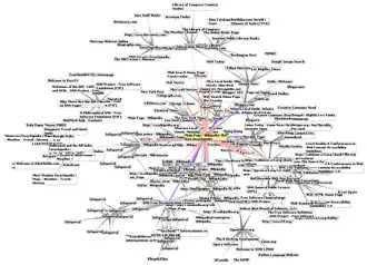 Les pages sont en outre reliées les unes aux autres par des hyperliens internes permettant au lecteur de se déplacer à travers l'encyclopédie[Note 13]. D'autres hyperliens permettent de naviguer entre les différentes versions linguistiques ou de conduire vers ses projets frères, par exemple pour fournir une définition d'un mot sur le Wiktionnaire ou une galerie d'images sur Wikimedia Commons[Note 14]. Un clic de souris sur les illustrations de Wikipédia conduit à une page de description du fichier multimédia indiquant notamment le nom de l'auteur et la licence sous laquelle il est publié.