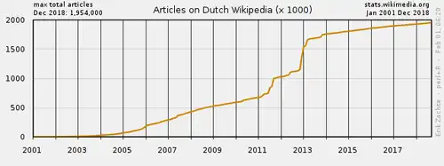Le , des articles créés par les bots Joopwikibot et GrashoofdBot permettent à la Wikipédia en néerlandais d'atteindre les 800 000 articles et ainsi de dépasser les éditions en russe et en japonais. Elle se classe alors 7e et rattrape très rapidement les éditions de Wikipédia qui la devancent. Le , elle est la quatrième Wikipédia avec plus de 900 000 articles et le , elle atteint le million d'articles. En , elle atteint le 1 300 000e article et devient la troisième Wikipédia la plus importante en nombre d'articles dépassant la version en français, notamment grâce à l'aide de plusieurs bots.