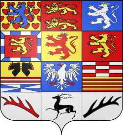 Parti de deux coupé de trois : au 1) d’or semé de cœur de gueules, au lion d’azur armé lampassé de gueules brochant suer le tout, au 2) de gueules à deux léopards d’or armés et lampassés d’azur au 3) d’azur au lion d’argent armé et lampassé et couronné d’or, au 4) de gueules au lion d’or armé et lampassé d’azur à la bordure componée d’argent et d’azur, au 5) avec 8) coupé en A) d’or au lion de gueules armé, lampassé et couronné d’azur au B) d’azur à l’aigle d’argent, becquée, languée et membrée de gueules, au 7) coupé au A) d’or à deux pattes d’ours adossées de sable armé de gueules, au B) recoupé en I) fascé de gueules et d’argent au II) gironnée d’argent et d’azur, au 9) coupé en A échiqueté d’argent et de gueules en B fascé d’or et de gueules, au 10) d’argent à la demi ramure de cerf de gueules mise en bande, au 11) d’argent au cerf de sable, au 12) d’argent à la demi ramure de cerf de sable mise en barre[1]. |