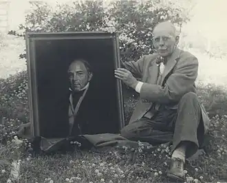 Photographie de William J. Whittemore tenant un portrait qu'il a peint.