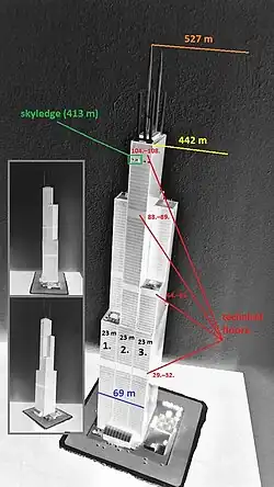 Flèche : 527 m Toit : 442,1 m Dernier étage : 412,7 m |