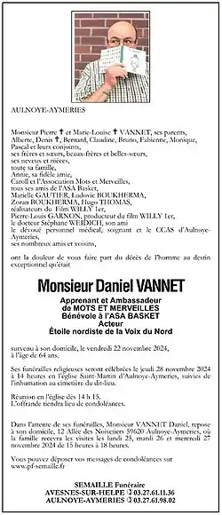 - ↑ Rafaela Biry-Vicente, « Vidéo - L'acteur amateur, ancien illettré, Daniel Vannet, crève l'écran », sur francebleu.fr, (consulté le ).
