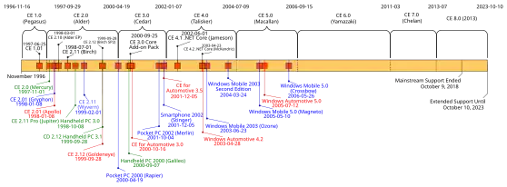 - 1.0 : Windows CE1 est sorti pour la première fois en 1996 (nom de code « Pegasus »). Cette version n'offrait pas les fonctionnalités systèmes actuelles, en particulier au niveau de l'ordonnancement et de la gestion mémoire.