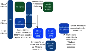 L'édition la plus courante de Windows XP est la version Familiale qui est conçue pour les utilisateurs domestiques tandis que la version Professionnelle, qui comprend entre autres des fonctionnalités réseau et d'administration supplémentaires, est destinée aux entreprises utilisant des réseaux et des serveurs. Il est à noter que cette dernière coûtait plus cher que l'édition Familiale. Windows XP Media Center a des fonctionnalités multimédia complémentaires pour permettre par exemple de voir et d'enregistrer la télévision, regarder plus confortablement des DVD. Windows XP pour Tablet PC est une version spécialement conçue pour les Tablet PC. Deux versions distinctes de Windows XP en 64 bits sont sorties, une pour les processeurs Itanium et une pour les processeurs x86-64.